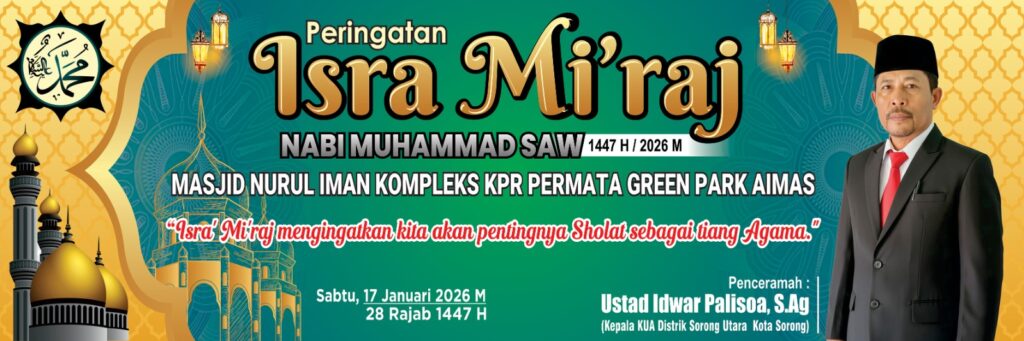 Sorong Today Masjid Nurul Iman, Kompleks KPR Permata Green Park, Distrik Aimas, Kabupaten Sorong, menggelar peringatan Isra Mi’raj Nabi Muhammad SAW 1447 Hijriyah pada Sabtu, 17 Januari 2026. Kegiatan ini diikuti oleh jamaah masjid dan warga sekitar dengan penuh khidmat.
