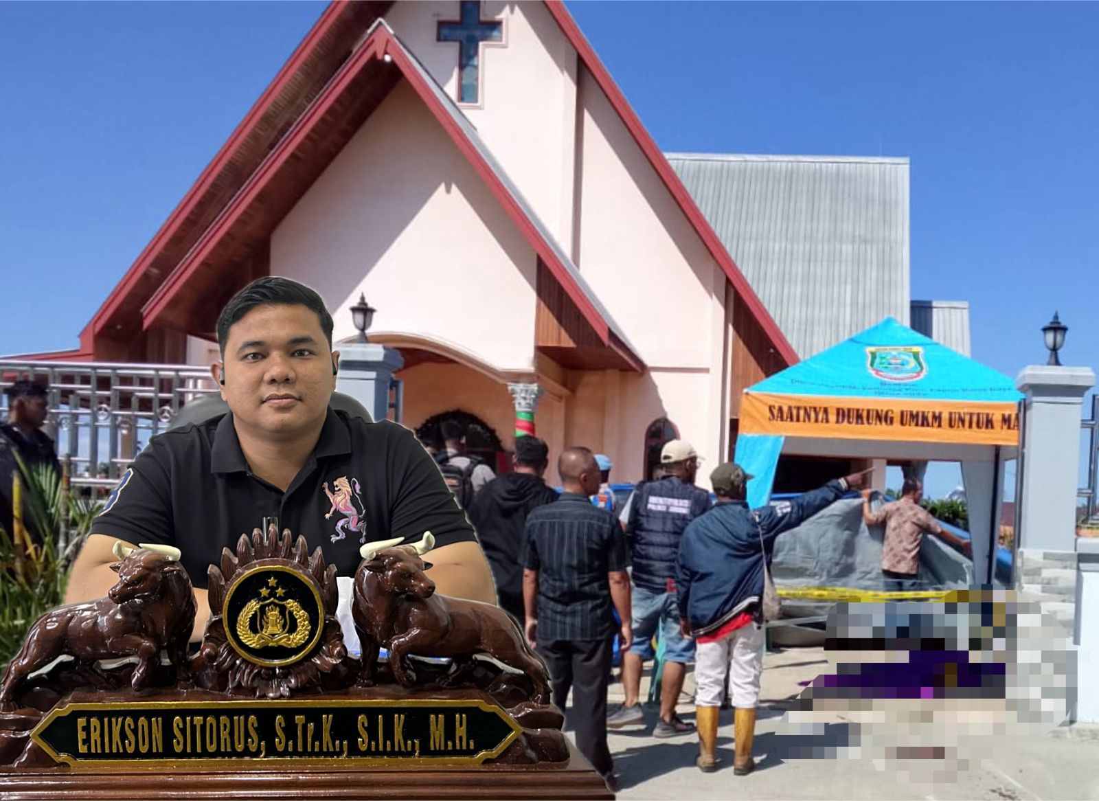 Setelah ditikam, korban sempat berusaha menyelamatkan diri dengan berlari ke arah depan gereja. Namun, korban akhirnya terjatuh di dekat pintu gerbang gereja.