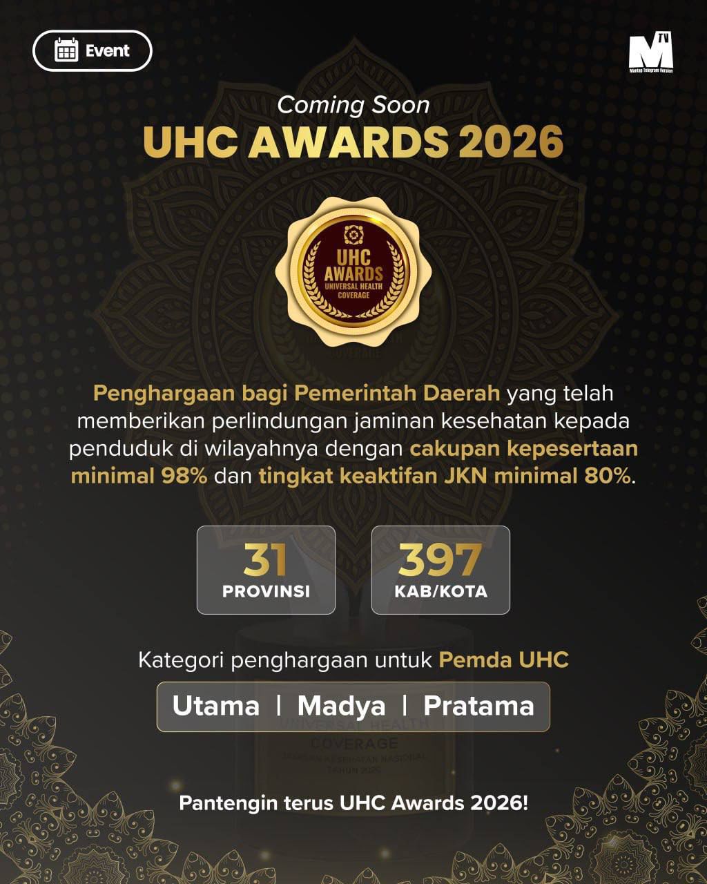 Penghargaan ini akan diserahkan langsung oleh Wakil Presiden Republik Indonesia pada Selasa, 27 Januari 2026, dengan tiga kategori penilaian, yakni Utama, Madya, dan Pratama, berdasarkan cakupan kepesertaan, tingkat keaktifan, serta kepatuhan pembayaran iuran.